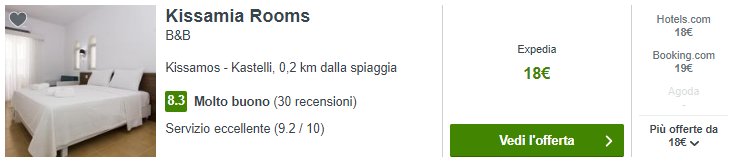 Vi proponiamo una settimana di vacanza ad un prezzo assolutamente eccezionale: €81 a testa incluso di voli a/r  da Roma (€45 a/r a testa), nella settimana tra il 22 ed il 26 Ottobre e soggiorno presso l’ottimo Kissamia Rooms  con recensioni perfette su Tripadvisor (4,5/5), a soli €18/notte in camera doppia!