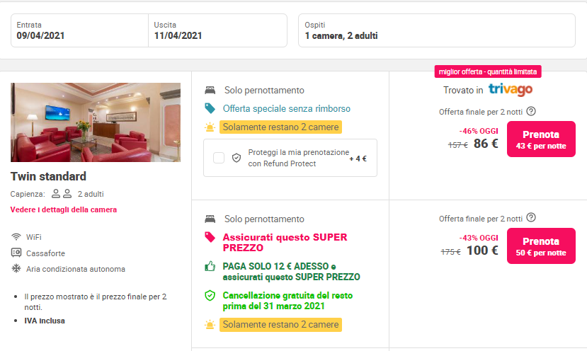 Come mostrato sopra, al costo minimo di €43/notte potrete prenotare la vostra camera doppia con colazione inclusa (€21.5/notte a testa) o €50/notte con cancellazione gratuita.