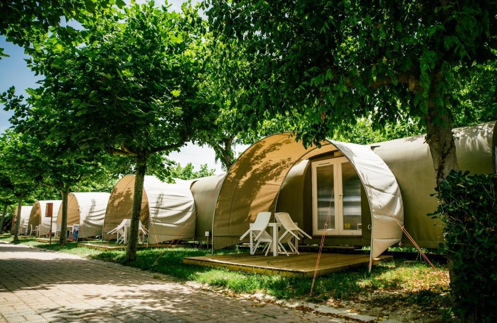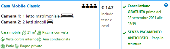 Il prezzo minimo mostrato di €44/notte (€33 a testa per 3 notti, €132/4) è valido per una “tenda/bungalow” ammobiliata con letti e verandina con tavolo e sedie (vedi foto sotto) Si potrà usufruire della cancellazione gratuita fino  a 2 giorni prima dalla partenza!
