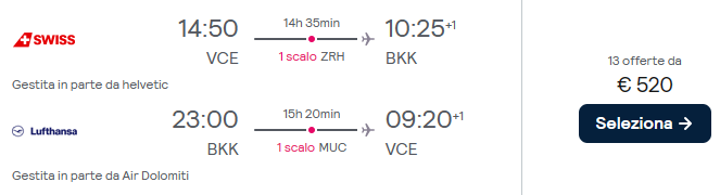 Lufthansa sta offrendo tariffe convenienti per volare in Thailandia! Prenota il tuo volo da Venezia, Roma, Firenze e Bologna a Bangkok a €520 a/r (classe Economy Light include il bagaglio a mano da 10 kg).
