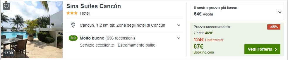 Durante le vostre vacanze in Messico, potreste soggiornare presso l’ottimo Sina Suites Cancún, un boutique hotel a 3 stelle situato nella esclusiva Zona Hotelera di Cancun! Il prezzo per camera doppia, nelle date citate, sarà di soli €67/notte!
