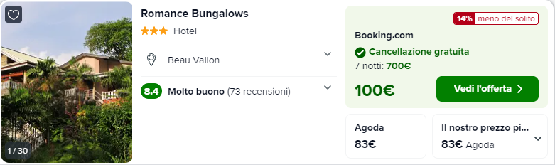 Durante la tua vacanza alle Seychelles potresti soggiornare presso l’ottimo Romance Bungalows! al costo di €83/notte per camera doppia!