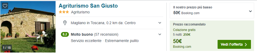 Questa volta abbiamo selezionato per te una struttura con ottime recensioni (4/5 Tripadvisor) in Toscana: l’Agriturismo San Giusto! Il prezzo minimo per una camera da 2 persone sarà di soli €50/notte nel periodo indicato, ovvero €25 a testa; con colazione inclusa!
