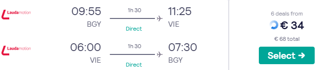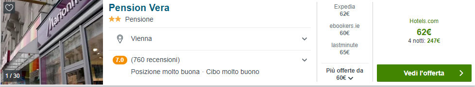Abbiamo creato per voi una combinazione volo + hotel davvero conveniente per 2 persone per trascorrere la Pasqua in Austria! L’esempio mostrato prevede voli nel periodo 8-12 Aprile e soggiorno in una camera doppia presso la Pension Vera con recensioni su Tripadvisor pari a 3/5. La tariffa per questa sistemazione è di €60/notte, ovvero €240 complessivi (€120 a testa)