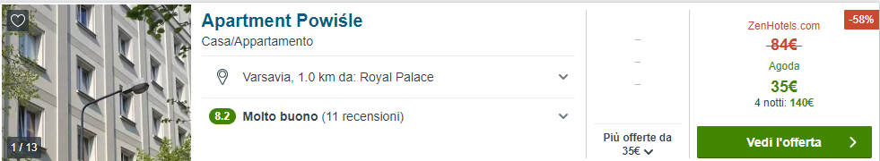 Abbiamo creato per voi una combinazione volo + hotel davvero conveniente per 2 persone per trascorrere la prossima Pasqua nella capitale polacca, Varsavia! L’esempio mostrato prevede voli da Bergamo nel periodo 11-15 Aprile e soggiorno in una camera doppia presso il residence Apartment Powiśle. La tariffa minima per questa sistemazione è di €35/notte, ovvero €140 complessivi (€70 a testa). Come mostrato sopra, prezzi abbordabili anche da Roma e Bologna.