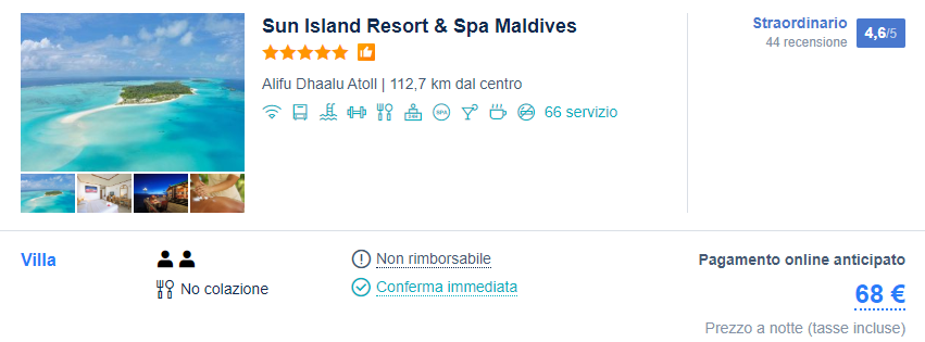 La tua scelta tra queste fantastiche tariffe è ricaduta sulle Maldive?  Fai una vacanza da re presso la struttura a 5 stelle Sun Island Resort a partire da soli €67/NOTTE per una prenotazione da 2 persone!
