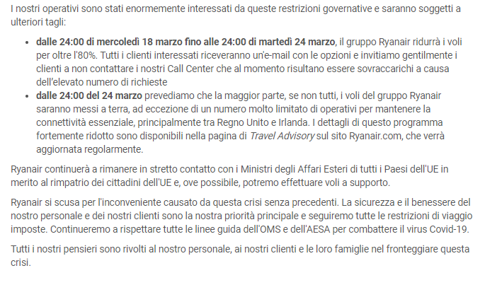 Inoltre, in data odierna Mercoledì 18 Marzo, la compagnia low cost irlandese comunica nuovi tagli del proprio traffico aereo fino all’80%: