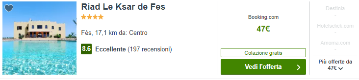 Durante i tuoi giorni a Fez, potresti prendere in considerazione il Riad Le Ksar de Fes, ottima struttura a 4 stelle a €47/notte per camera doppia con colazione inclusa.