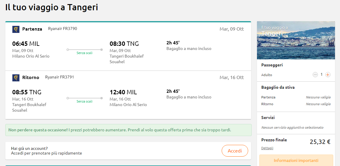 Davvero una bella tariffa Ryanair! Potrai organizzare un viaggio in Marocco low cost grazie a questi voli da Milano, Treviso o Torino a Tangier e Fez con tariffe a partire da soli €25 a/r!