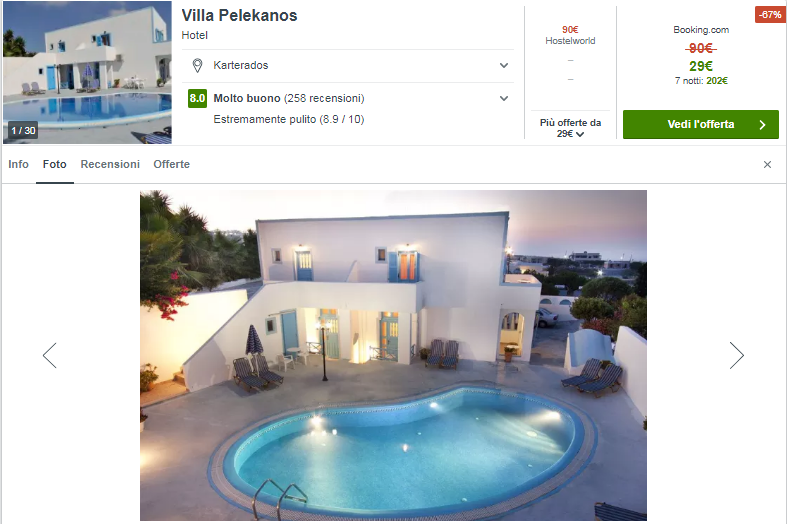 Sfruttando le interessanti tariffe Volotea, ti proponiamo questa combinazione di volo + pernotto per 2 persone, con partenze da Roma, Palermo, Napoli e Bari ad un costo assolutamente eccezionale! Il prezzo comprende il costo del volo e del soggiorno presso la struttura  Villa Pelekanos, a soli €29/notte per camera doppia grazie allo sconto del 63% trovato! Il prezzo totale a persona di €159 è dato dalla somma del costo del volo, €58, e del pernotto di €101 per 7 notti. Segui i link per procedere alla prenotazione!