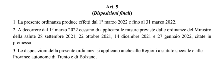 “A decorrere dal 1° marzo 2022 cessano di applicarsi le misure previste dalle ordinanze del Ministro della salute 28 Settembre 2021, 22 Ottobre 2021, 14 Dicembre 2021 e 27 Gennaio 2022”.