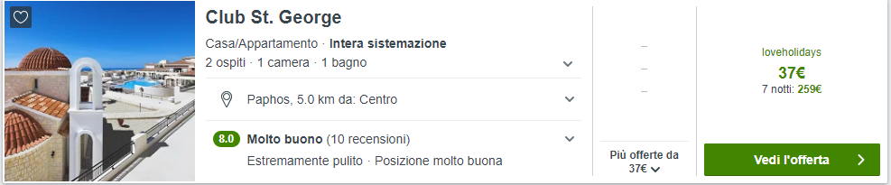 Proponiamo un pacchetto per 4 persone (disponibile anche per 3 o 2) nel mese di Maggio presso una buona struttura, il Resort Club St. George, al costo di soli €37 a notte per un appartamento. I voli selezionati, dal 24 al 31 Maggio dall’aeroporto di Orio al Serio costeranno solamente €59 a testa. Il prezzo totale minimo per persona di €123,75 corrisponde alla somma tra il valore del volo, €59, e del pernotto di €64,75 a testa, per 7 notti.