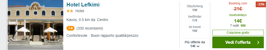 Il prezzo totale di €98 a testa è dato dalla somma del costo del volo (€49 a/r) e del pernotto presso  una buona struttura con piscina, Hotel Lefkimi, al prezzo di soli €14 a notte per una camera per 2 persone, ovvero €49 a testa per 7 notti grazie allo sconto del 33% trovato! La struttura vanta buone recensioni su Tripadvisor: 3,5/5!