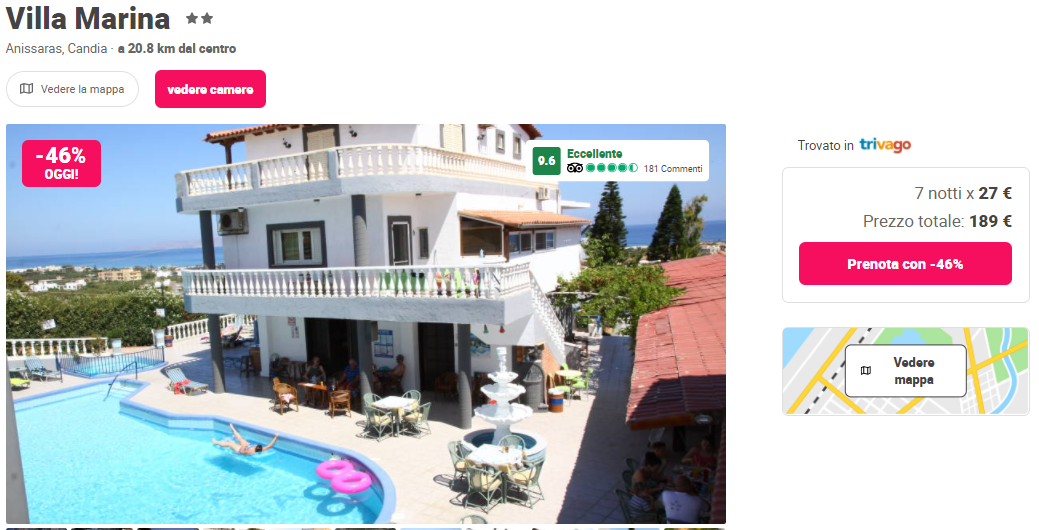 Vi proponiamo una settimana, per 2 persone, ad un prezzo assolutamente interessante! I voli a/r presi come esempio da Milano Malpensa costano solamente €21 a/r a testa e il soggiorno presso l’ottima struttura Villa Marina costerà €94,5 a testa per 7 notti (€189/2). Il costo a persona sarà quindi di €136.