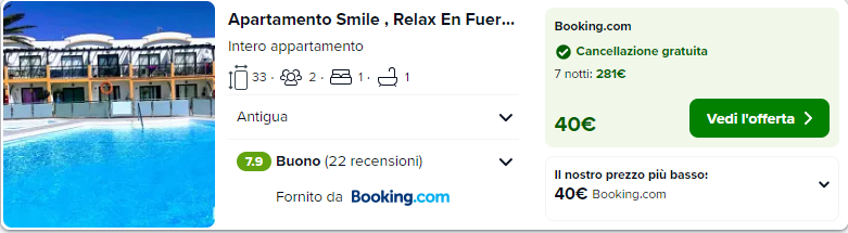 Proponiamo un pacchetto per 2 persone presso Apartamento Smile al costo complessivo di €195 a testa. Il costo citato è dato dalla somma del costo del volo €56 e del pernotto €140.