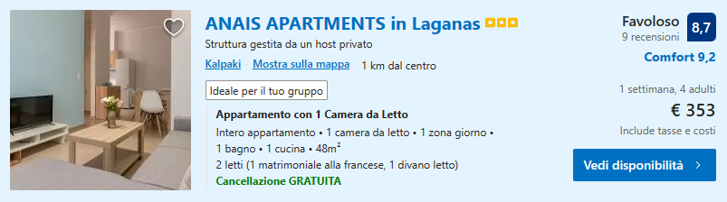 Abbiamo selezionato per voi Anais Apartments in Laganas, con recensioni eccellenti su Booking 8.7/10 e situato nella famosa località balneare di Laganas. Questo appartamento da 48 m² dispone di cucina, aria condizionata, area soggiorno con divano letto e TV, camera da letto e patio o balcone.