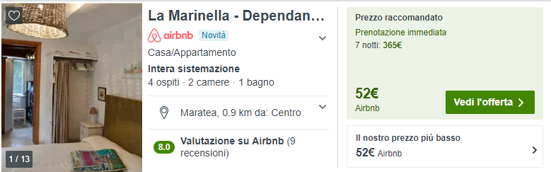 Come mostrato sopra, il prezzo minimo è di  €52/notte (ovvero €13/notte a persona nel caso di una prenotazione da 4 persone) valido sia per 4 che 3 o 2 ospiti.