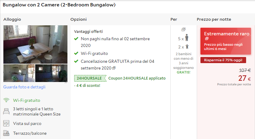 Come mostrato sopra, al costo minimo di €27/notte potrete prenotare un bungalow con 2 camere da letto per un massimo di 5 ospiti (e 2 bambini sotto ai 3 anni gratis): €47,25 a testa (€189/4) per 7 notti! Nel caso di una prenotazione da 2 ospiti, invece, il costo minimo sarà di €94,5 a testa per 7 notti!