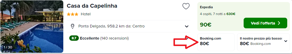La struttura che vi proponiamo è l’aparthotel Casa da Capelinha, disponibile al costo di €560 per 7 notti (€140 a testa) per una prenotazione da 4 ospiti o €378 per una prenotazione da 2 ospiti.