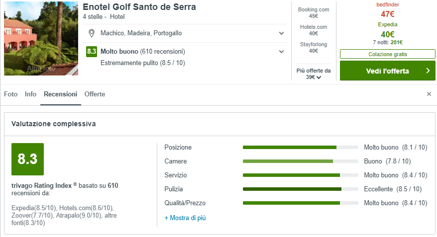 Durante la tua vacanza a Madeira, potrai soggiornare presso l’ottima struttura a 4 stelle Enotel Golf Santo de Serra a €40/notte per camera doppia e con colazione inclusa! La strutta vanta recensioni ottime su Tripadvisor (4/5).