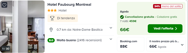 Proseguirete il viaggio visitando Montreal? Potreste optare per l’ottimo Hotel Faubourg Montreal al costo di €66/notte per camera doppia (o singola)!