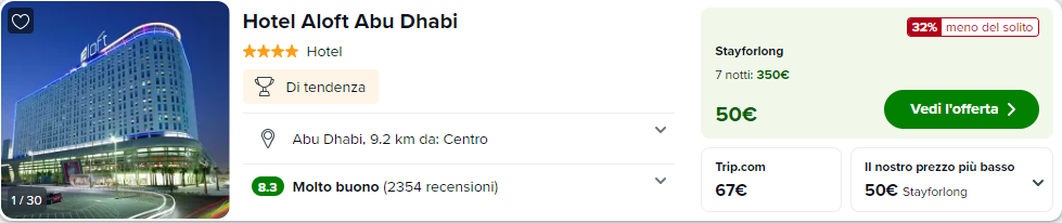 Durante i vostri giorni ad Abu Dhabi potreste optare per un soggiorno a 4 stelle presso l’ottimo l’Hotel Aloft Abu Dhabi con ottime recensioni e disponibile a €36/notte con colazione inclusa per camera doppia.