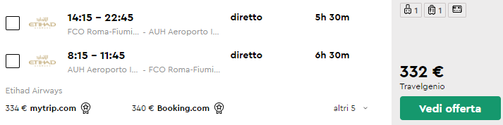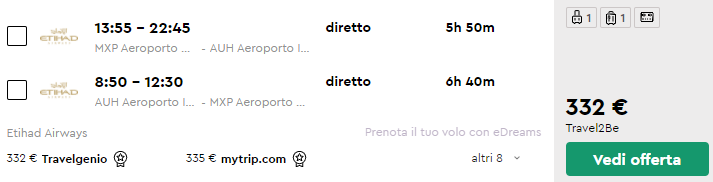 Davvero un bel prezzo per trascorrere qualche giorno ad Abu Dhabi! Prenota questi voli offerti dall’ottima Etihad Airways (4 stelle Skytrax) da Milano Malpensa e Roma Fiumicino a partire da soli €340 a/r!