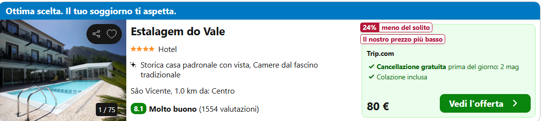 Durante la vostra vacanza a Madeira potreste soggiornare presso l’ottimo Hotel Estalagem do Vale disponibile al costo di €80/notte con colazione inclusa per camera doppia.