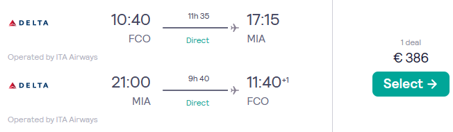 Nuove date disponibili! Sfrutta queste tariffe sui voli diretti ITA Airways per Miami da Roma Fiumicino: si vola con soli €386 a/r! (classe Economy Light, solo bagaglio a mano)
