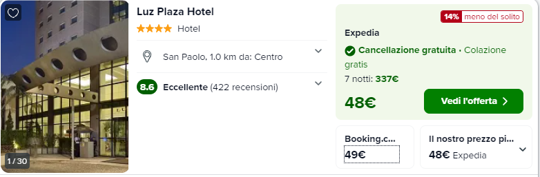 A San Paolo potreste optare per l’hotel 4 stelle Luz Plaza Hotel, a soli €48/notte per camera doppia!
