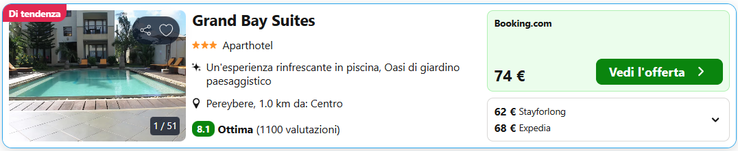 Potreste prendere in considerazione l’ottimo Aparthotel Grand Bay Suites, disponibile al costo di €62/notte per camera singola o doppia.