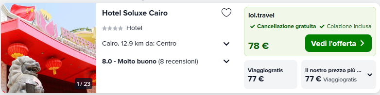 Vi consigliamo l’ottima struttura a 4 stelle Hotel Soluxe Cairo situata nei pressi delle Piramidi di Giza e disponibile al costo di €78/notte per camera doppia con colazione inclusa.