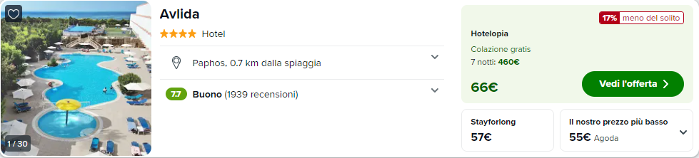 Consigliamo un soggiorno a 4 stelle presso l’ottimo Avlida Aparthotel a €55/notte con colazione inclusa (prenotazione da 2 ospiti)