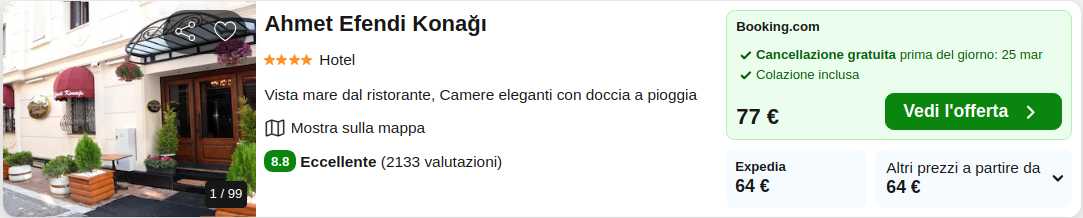 L’Ahmet Efendi Konağı è un hotel 4 stelle con ottime recensioni e situato in posizione ottimale! Potrete prenotare la vostra camera doppia con colazione inclusa a soli €64/notte.