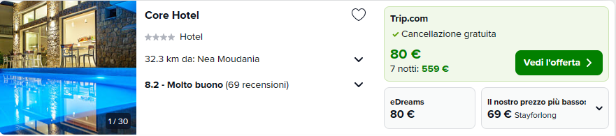 Dove soggiornare nella Penisola Calcidica in piena estate? Suggeriamo l’eccellente struttura a 4 stelle Core Hotel , disponibile al costo di €69/notte per camera doppia con cancellazione gratuita.