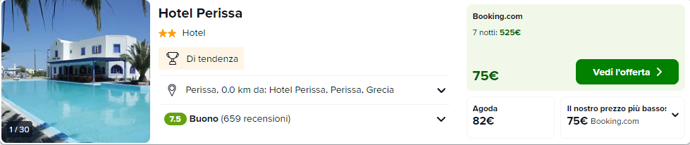 Potreste considerare l’hotel Hotel Perissa con recensioni eccellenti su Tripadvisor (4/5) e disponibile a soli €57/notte per camera doppia!