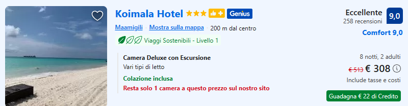Per le vostre vacanze alle Maldive potreste optare per l’ Hotel Koimala nell’atollo di Raa. Questa struttura a 3 stelle con recensioni eccellenti è disponibile al costo di €38/notte per camera doppia.