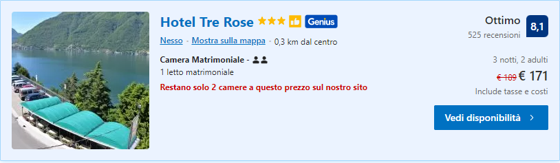 Hotel Tre Rose vanta ottime recensioni su Tripadvisor (4/5) e gode una fantastica vista sul Lago. Situata a Nesso, questa struttura offre parcheggio gratuito, un ristorante in loco con vista lago e l’opzione di pernotto con colazione. Le camere dispongono di aria condizionata, TV LCD, minibar, connessione Wi-Fi gratuita e offrono vista giardino o vista lago.