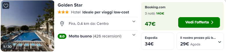 Abbiamo selezionato per voi Hotel Golden Star situato a Fira e con recensioni ottime su Trivago (8/10). Questa struttura dispone di una piscina all’aperto e una splendida terrazza affacciata sul Mar Egeo. Le camere dispongono di balcone o patio, aria condizionata, minifrigorifero e bagno privato.