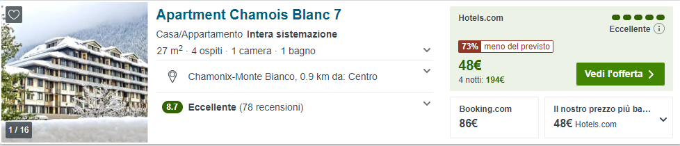 Come mostrato sopra, il costo minimo per appartamento è di €77/notte per 3 notti o €82/notte per 2 notti, ovvero rispettivamente €115 a testa o €82 a testa.