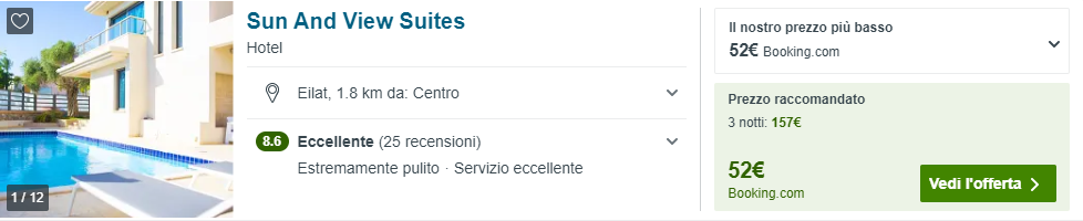 Abbiamo creato per voi una combinazione volo + hotel davvero conveniente per 2 persone per trascorrere un weekend in Israele! L’esempio mostrato prevede voli nel fine settimana 12-15 Marzo e soggiorno presso l’ottimo Sun And View Suites con recensioni eccellenti su Tripadvisor (4,5/5). La tariffa per questa sistemazione è di €52/notte (ovvero €78 complessivi a testa per le 3 notti)!