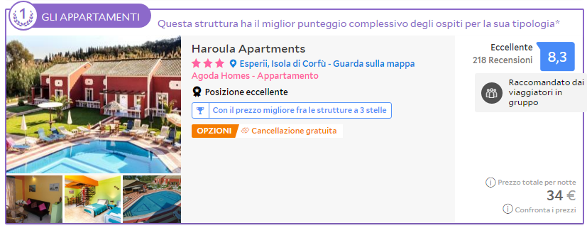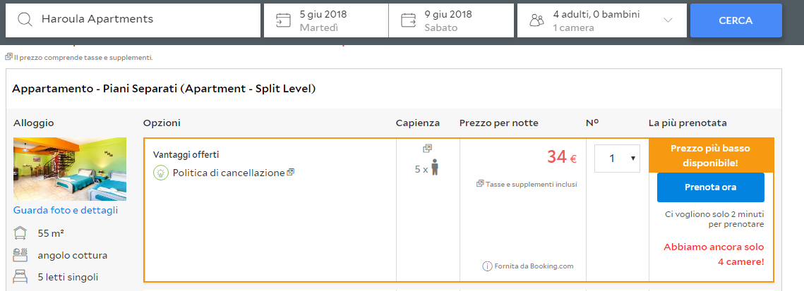 Sei pronto a prenotare il tuo break di 4 giorni a Corfù? Ti spieghiamo come procedere alla prenotazione! Clicca qui Haroula Apartments sarà il primo risultato nella lista di ricerca. Clicca per selezionarlo ed in seguito verrai reindirizzato e vedrai questa schermata, dalla quale potrai modificare il numero di adulti e procedere con la prenotazione: