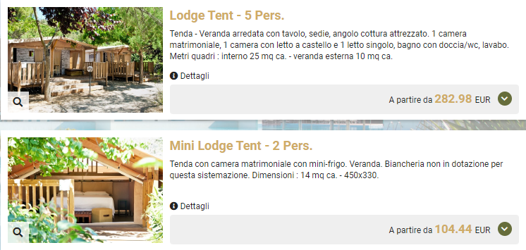 Come mostrato sotto in un esempio da 7 notti, il prezzo minimo per una Mini Lodge Tent è di soli €15/notte (ovvero €7,5/notte a persona) nel caso di una prenotazione da 2. Ad un costo extra è possibile aggiungere alla vostra prenotazione: il noleggio bici, ombrellone e lettini in spiaggia privata, la mezza pensione o la pensione completa.