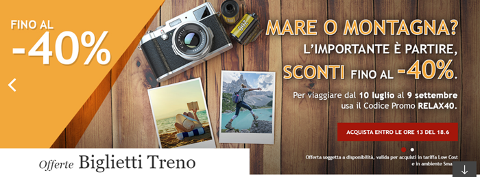 Il codice di sconto in questione è RELAX40 e puo’ essere utilizzato acquistando i biglietti nel sito ufficiale di Italo,entro le ore 13:00 del 18 Giugno. Il periodo in cui potrà essere sfruttato va da Martedì 1o Luglio a Domenica 9 Settembre.