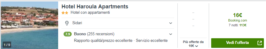 Il prezzo totale minimo usato come esempio è dato dalla somma del costo del volo da Bologna nella settimana 7-14 Maggio , €30 a testa, e del pernotto presso l’ottimo Hotel Haroula Apartments al prezzo di soli €16 a notte per 2 persone, ovvero €56 a testa per 7 notti! La struttura vanta ottime recensioni su Tripadvisor: 4/5!