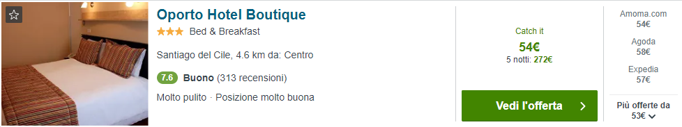 Considerando che con questo volo potrete arrivare a Santiago del Cile nel weekend, vi consigliamo di pernottare in uno dei quartieri più vivi della capitale: Providencia! In questa zona, l’Oporto Hotel Boutique è un’ottima soluzione, con recensioni di 3,5/5 su Triadvisor. Qui potrai prenotare la tua camera doppia al costo di €53/notte!
