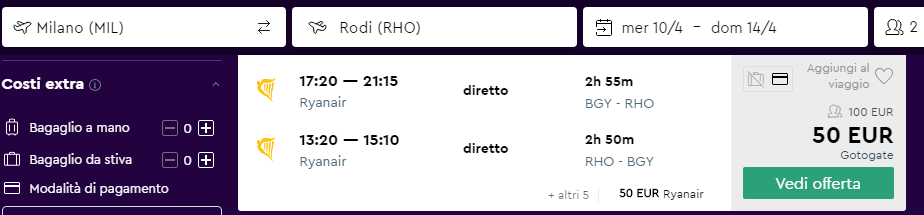 Ottima occasione per godere del primo sole primaverile in una delle più belle isole Greche! L’isola di Rodi offre soluzioni per tutti i gusti, dal relax delle spiagge della Baia di Stegna alle notti folli di Faliraki. Perdetevi tra le stradine della suggestiva Lindos o della Città Vecchia di Rodi, assaporate piatti tipici come la moussaka ed il kleftiko ammirando l’Acropoli illuminata di sera e fate un tuffo nella meravigliose spiagge di Theogolos o Tsambika!