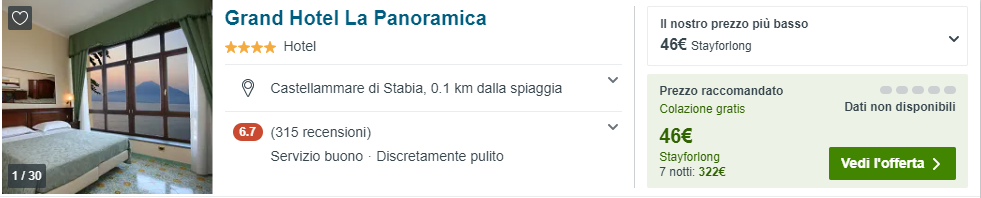 Grand Hotel La Panoramica è una struttura a 4 stelle situata sulla Strada Panoramica 119, tra la baia di Napoli e Sorrento, con buone recensioni su Tripadvisor (3.5/5) e su Booking (8/10). La sua posizione privilegiata la rende una scelta perfetta per visitare le mete più belle dell’affascinante Penisola Sorrentina, della Costiera Amalfitana e del Golfo di Napoli quali Sorrento, Amalfi, Positano, Ravello, Pompei e Ercolano.