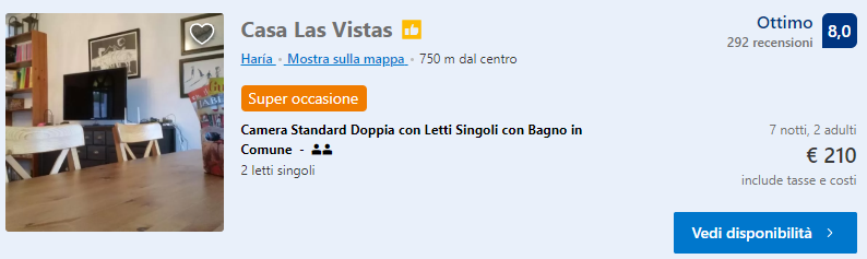 Vi proponiamo una soluzione davvero low cost per 2 persone per trascorrere 7 giorni nell’isola di Lanzarote! Con soli €171 complessivi a testa potrete soggiornare, dal 5 al 12 Maggio, presso una buona struttura, il Casa Vista La Vega valutato 8/10 e disponibile a soli €30/notte, ovvero €210 per 7 notti in una camera doppia in appartamento.