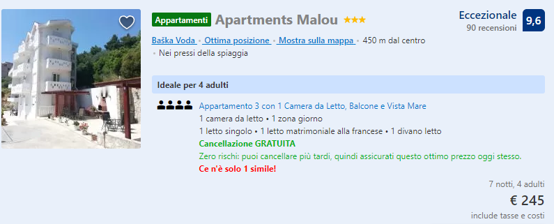 Questa volta vi proponiamo una soluzione per 4 persone davvero low cost per trascorrere 7 giorni di vacanza in Dalmazia, Croazia! Con soli €108 complessivi a testa potrete soggiornare, dal 18 al 25 Settembre (da Venezia o da Palermo), presso l’eccellente struttura Apartments Malou, con recensioni fantastiche su Booking (9,6/10).